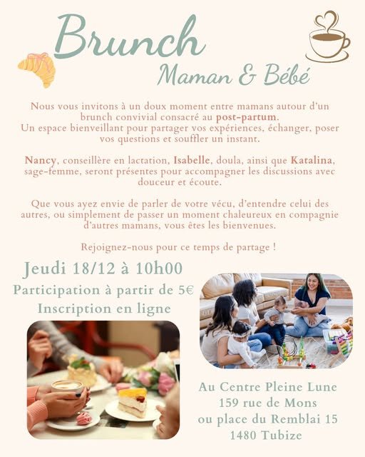 Centre Pleine Lune Place de Remblai, 15, TubizeNous vous invitons à un doux moment entre mamans autour d'un brunch convivial consacré au post-partum. Un espace bienveillant pour partager vos expériences, échanger, poser vos questions et souffler un instant. Nancy, conseillère en lactation, Isabelle, doula, ainsi que Katalina, sage-femme, seront présentes pour accompagner les discussions avec douceur et écoute. Que vous ayez envie […]